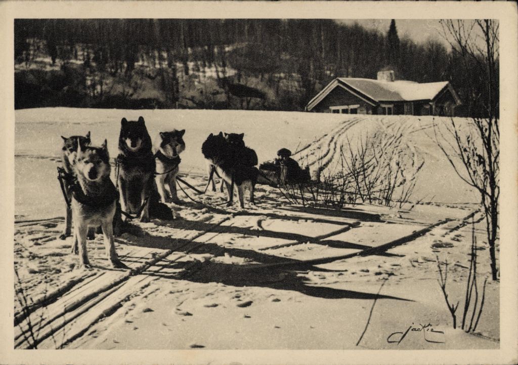 The Laurentide Inn, huskies bruiging [sic] home the remains of a hearty lunch at the ski chalet, Ste Agathe des Monts (P.Q., Canada)
