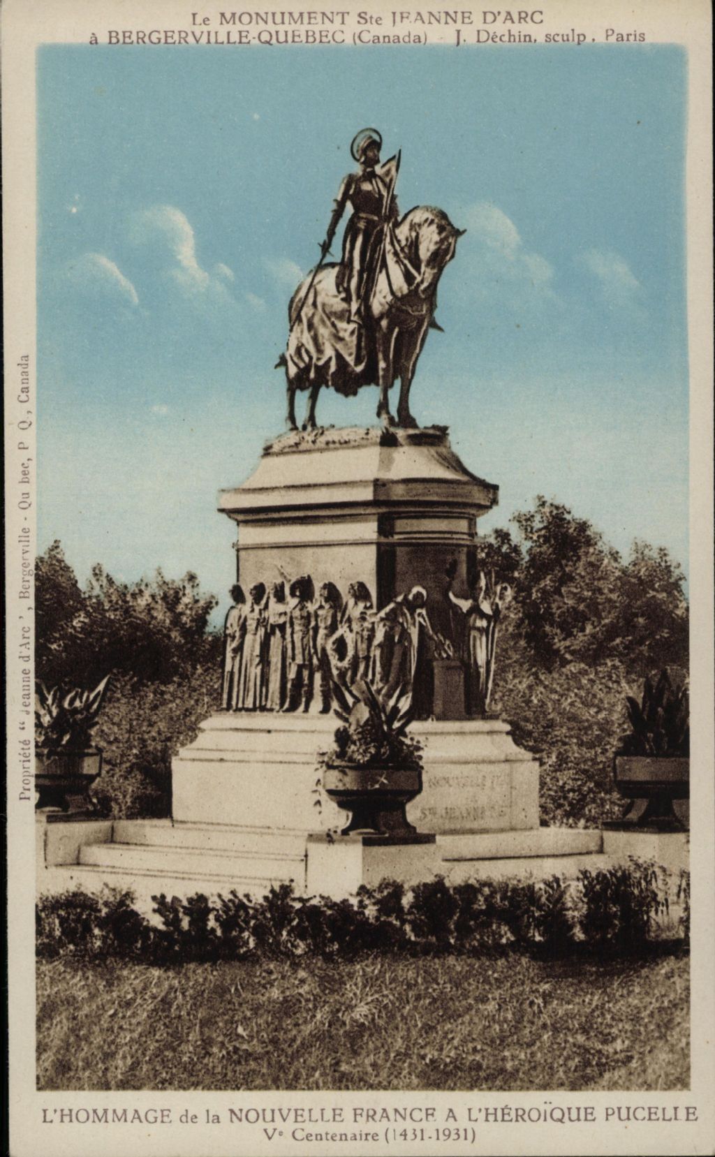 Le monument Ste Jeanne d'Arc à Bergerville-Québec (Canada), J. Déchin, sculp., Paris l'hommage de la Nouvelle France à l'héroïque pucelle, Ve centenaire (1431-1931)