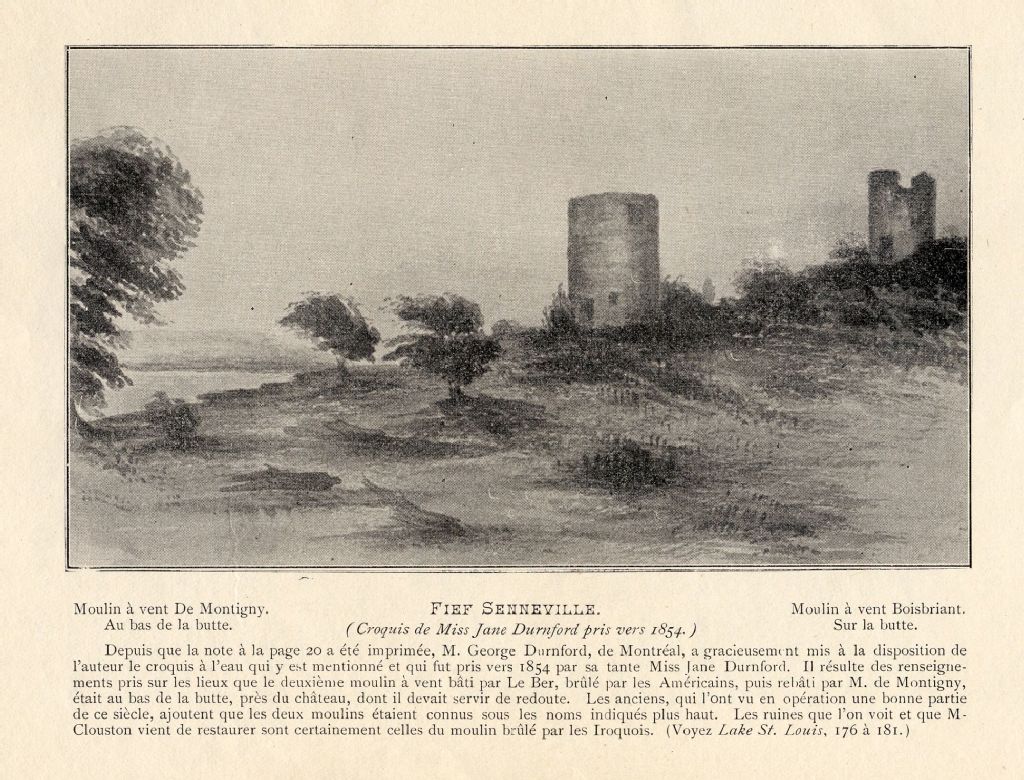 Fief Senneville (Croquis de Miss Jane Durnford pris vers 1854.) Moulin à vent De Montigny. Au bas de la butte. Moulin à vent Boisbriant. Sur la butte