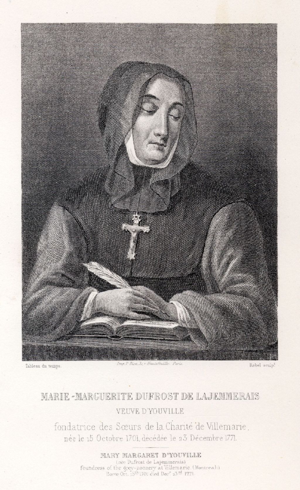 Marie-Marguerite Dufrost de Lajemmerais, veuve d'Youville. Fondatrice des Soeurs de la Charité de Villemarie, née le 15 octobre 1701, décédée le 23 décembre 1771