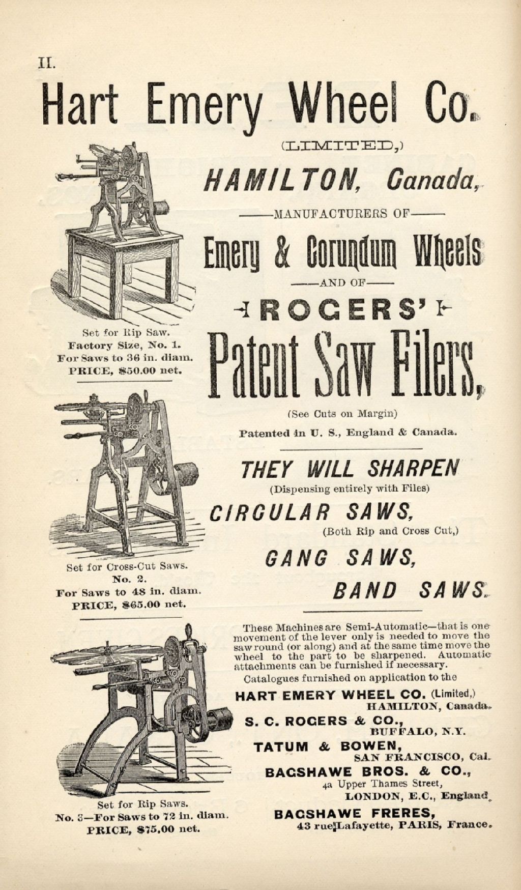 [Three Saw Filers Models Manufactured by the Hart Emery Wheel Co., Hamilton, Ont.]