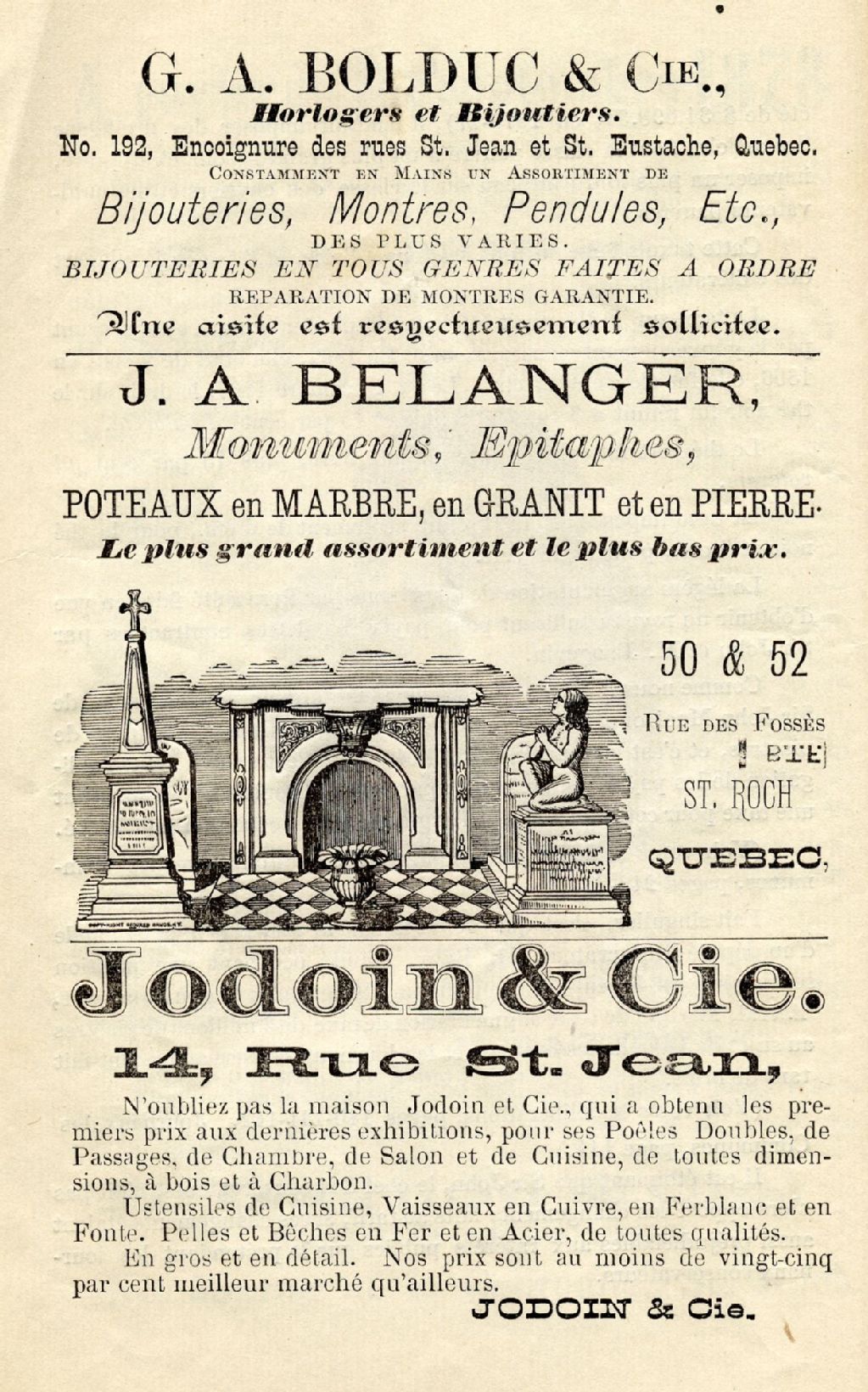 J. A. Bélanger, monuments, épitaphes, poteaux en marbre, en granit et en pierre