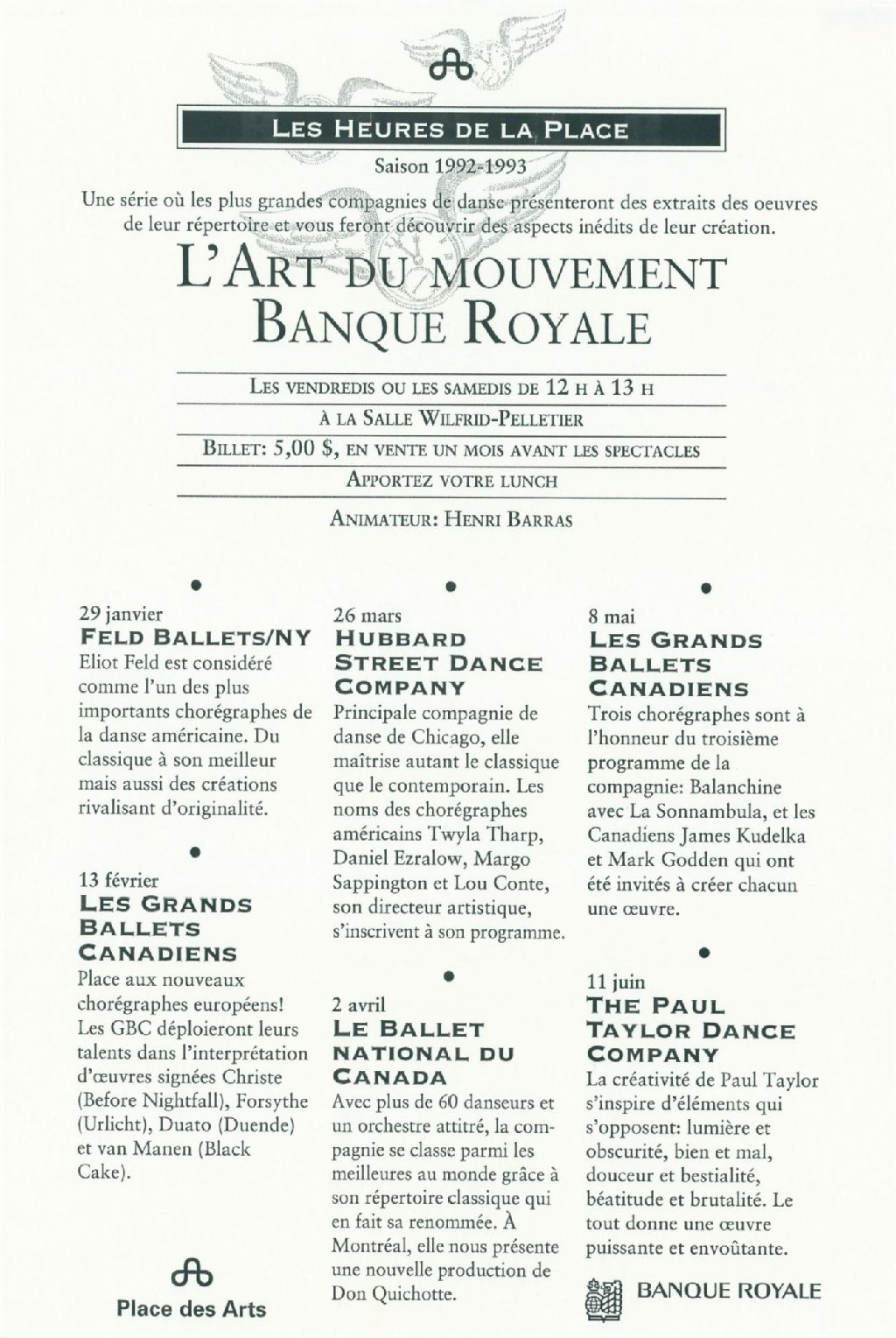 L'art du mouvement Banque royale Feld Ballets... Les Grands ballets canadiens... Hubbard Street Dance Company... : Les heures de la Place, saison 1992-1993