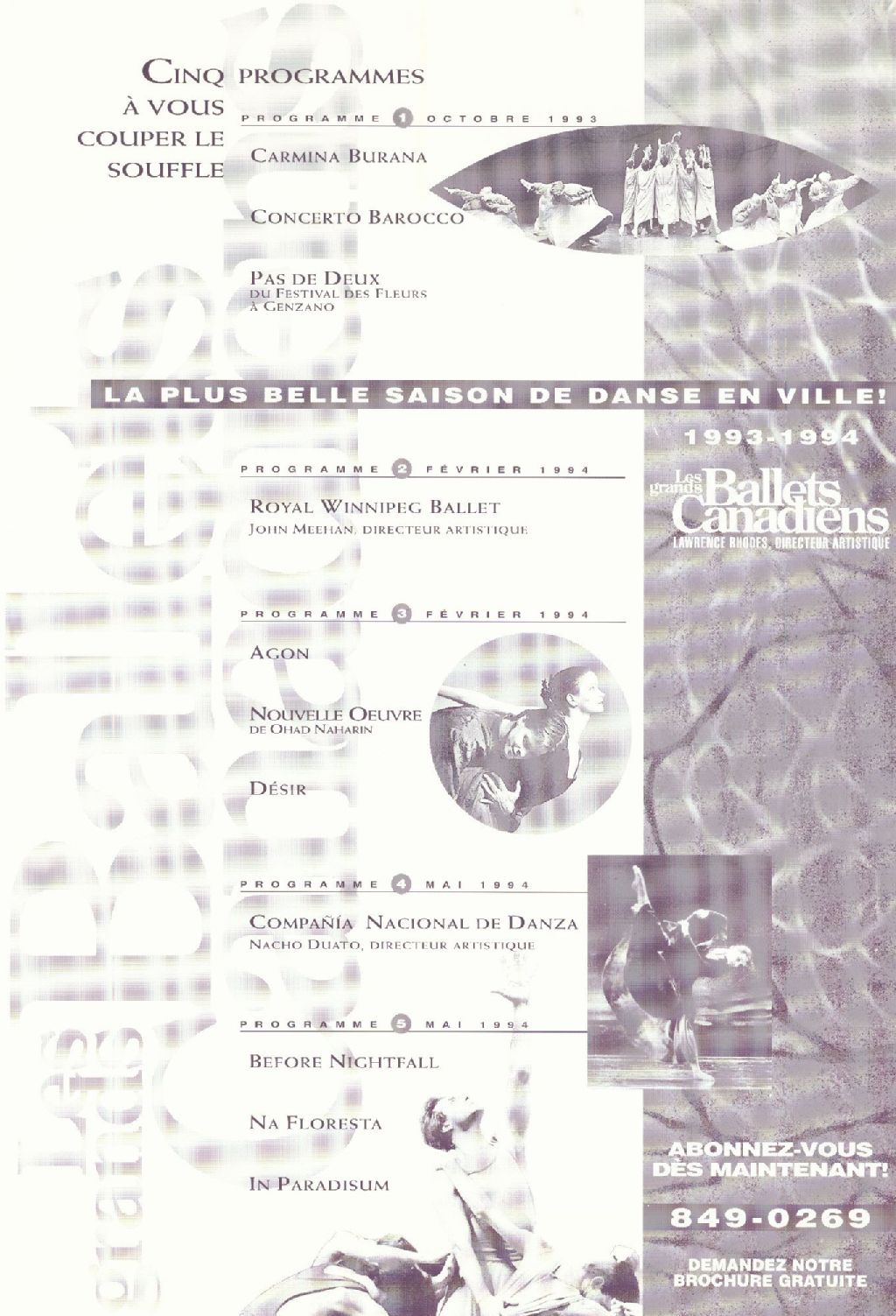 La plus belle saison de danse en ville! 1993-1994 cinq programmes à couper le souffle : Carmina Burana... Royal Winnipeg Ballet... Agon... Compania nacional de Danza... Before night fall...