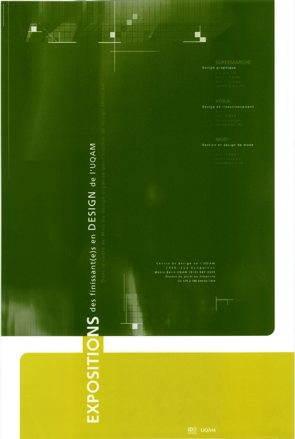 Expositions des finissant(e)s en design de l'UQAM, dans le cadre du Mois du design organisé par l'Institut de design Montréal Supermarché, design graphique ... Voilà, design de l'environnement ... MOD3, gestion et design de mode...