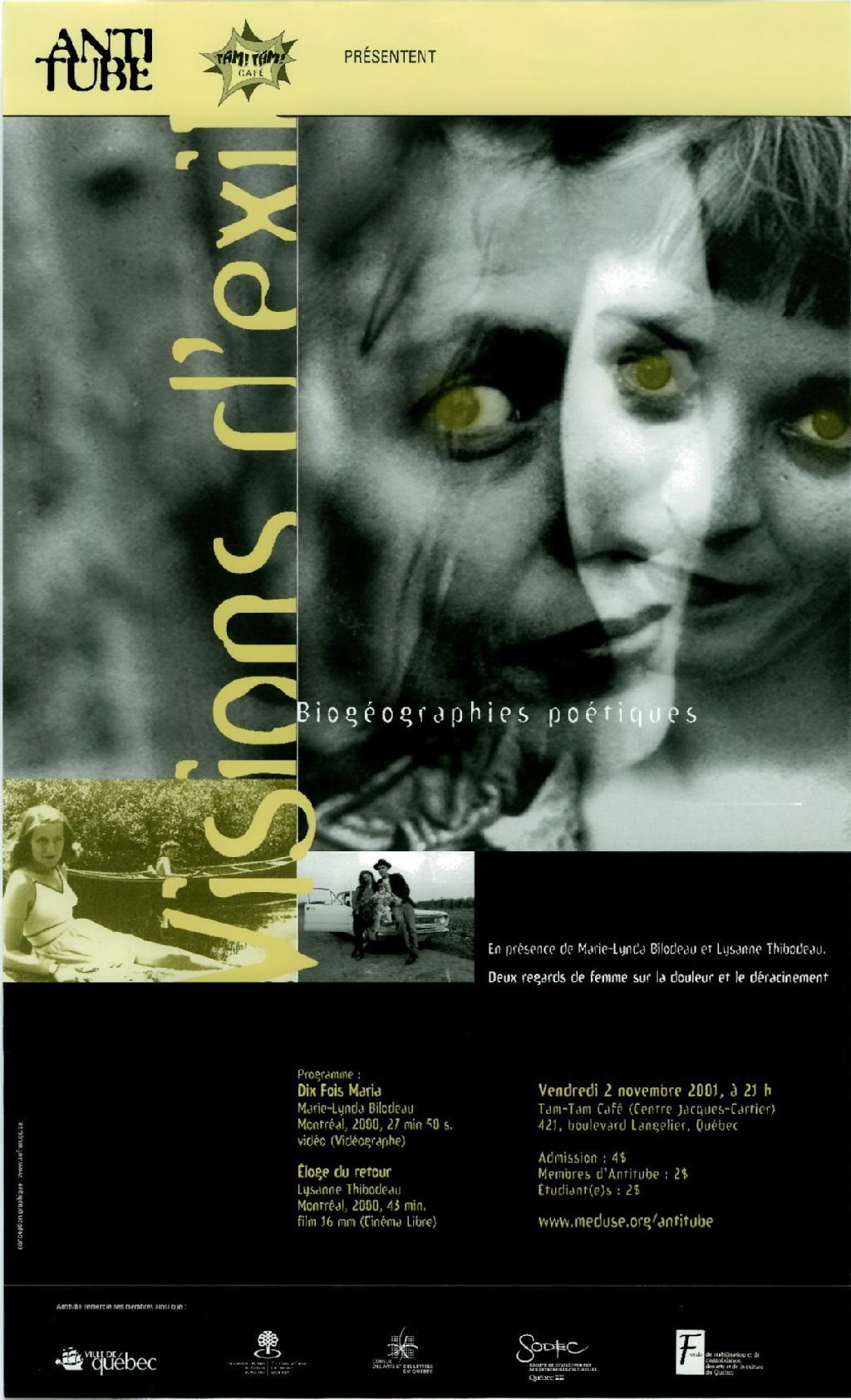 Antitube [et] Tam! Tam! café présentent Visions d'exil, biogéographies poétiques... en présence de Marie-Lynda Bilodeau et Lysanne Thibodeau... Dix fois Maria... Éloge du retour