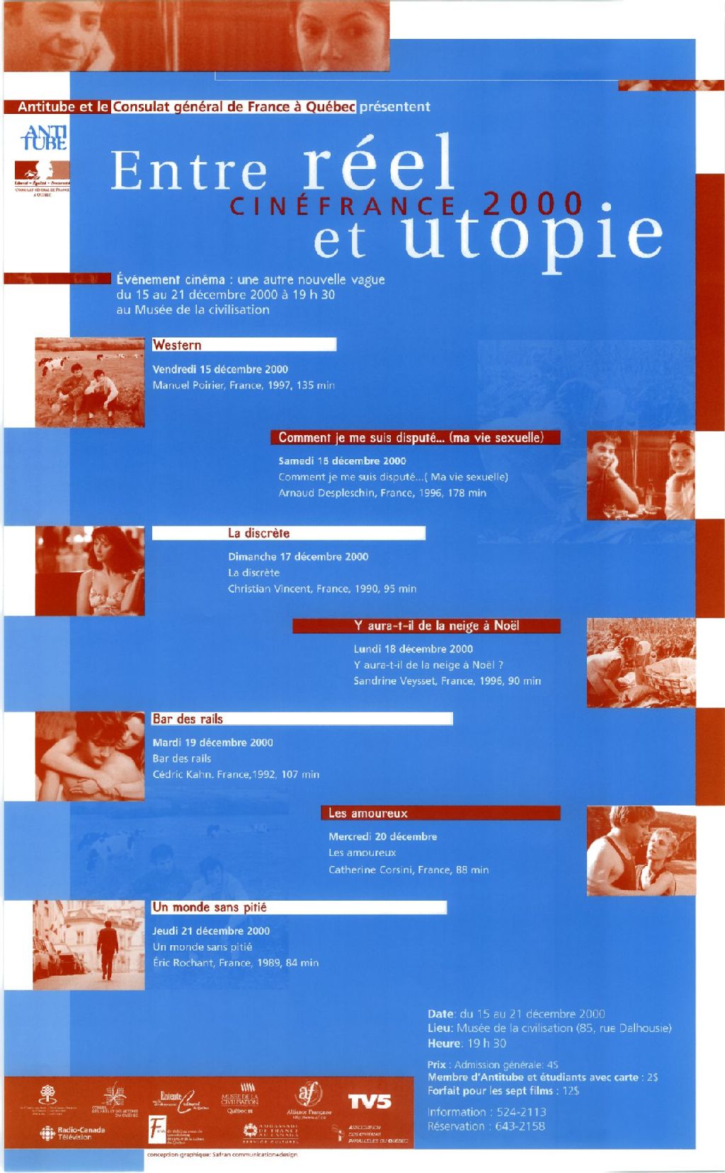 Antitube et le Consulat général de France à Québec présentent Entre réel et utopie Cinéfrance 2000 : Western... Comment je me suis disputé-- (ma vie sexuelle)... La discrète...