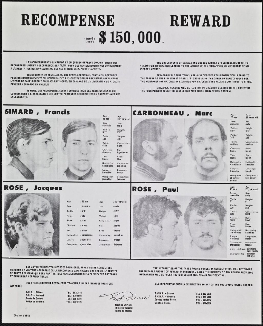 Récompense (jusqu'à) $150,000... les gouvernements du Canada et du Québec... pour des renseignements qui conduiraient à l'arrestation des ravisseurs ou des meurtriers de M. Pierre Laporte..., l'arrestation des ravisseurs de M. Cross... Simard, Francis..., Carbonneau, Marc..., Rose Jacques..., Rose, Paul... = Reward (up to) $150,000 the governments of Canada and Quebec jointly offer rewards... for information leading to the arrests of the kidnappers or murders of Mr. Pierre Laporte..., the arrests of the kidnappers of Mr. Cross...