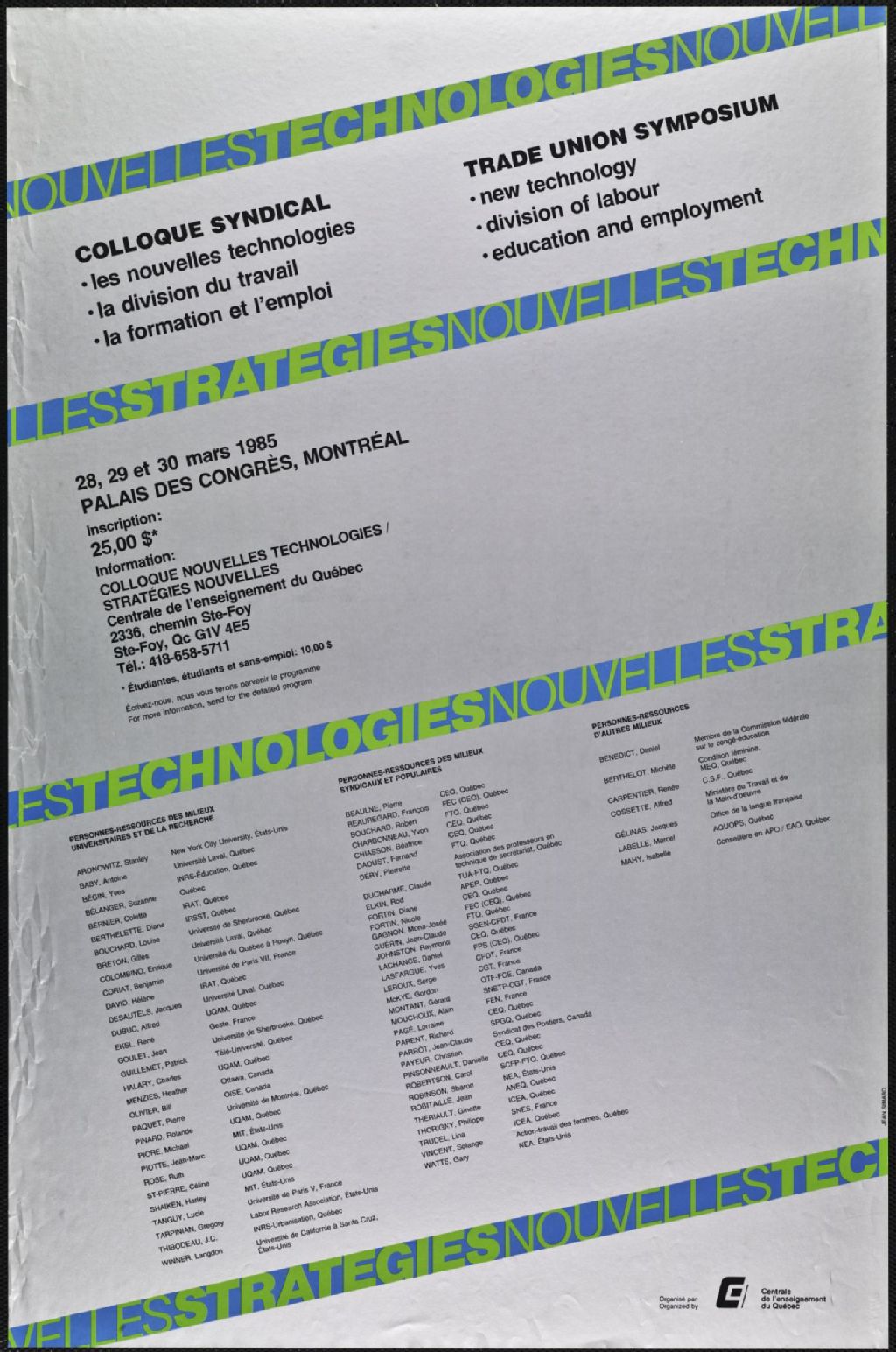 Colloque syndical Les nouvelles technologies, la division du travail, la formation et l'emploi Trade Union Symposium, New Technology, Division of Labour, Education and Employment