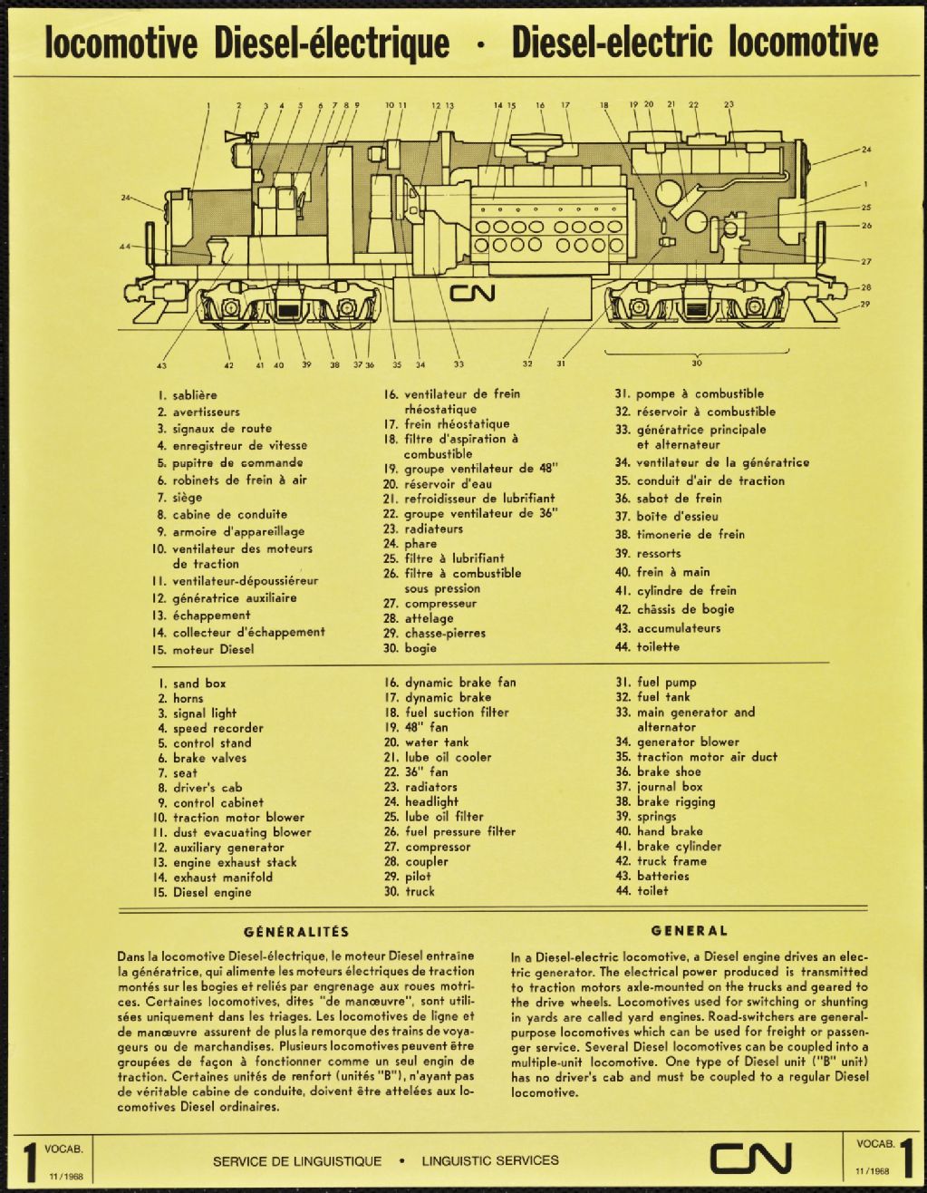 Locomotive diesel-électrique vocab. 1 = Diesel-electric locomotive...
