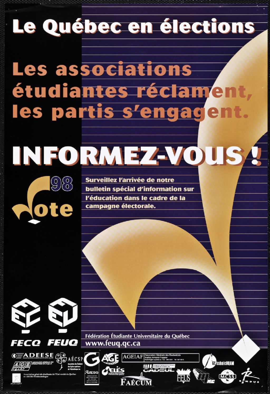 Le Québec en élections, les associations étudiantes réclament, les partis s'engagent, informez-vous! Vote 98...