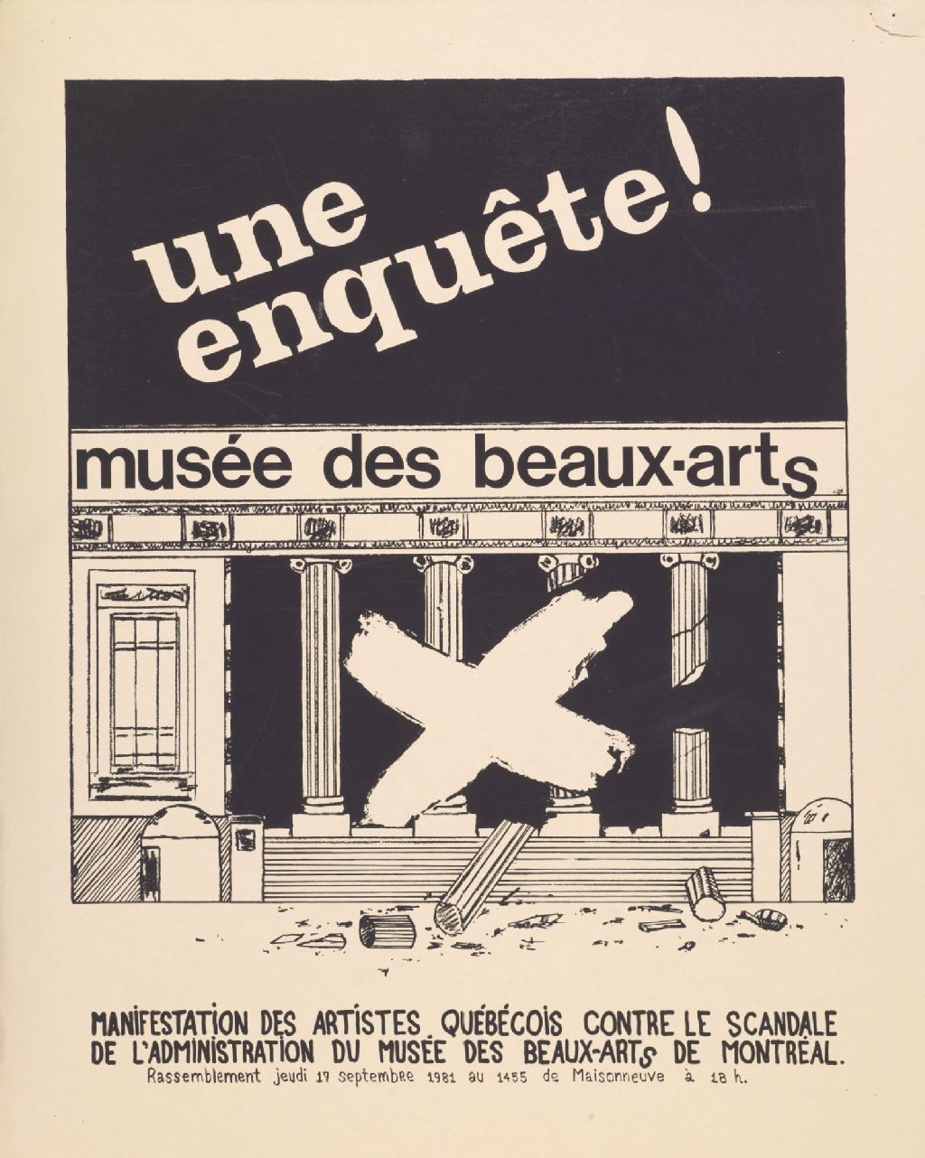 Une enquête! Musée des Beaux-arts manifestation des artistes québécois contre le scandale de l'administration du Musée des beaux-arts de Montréal