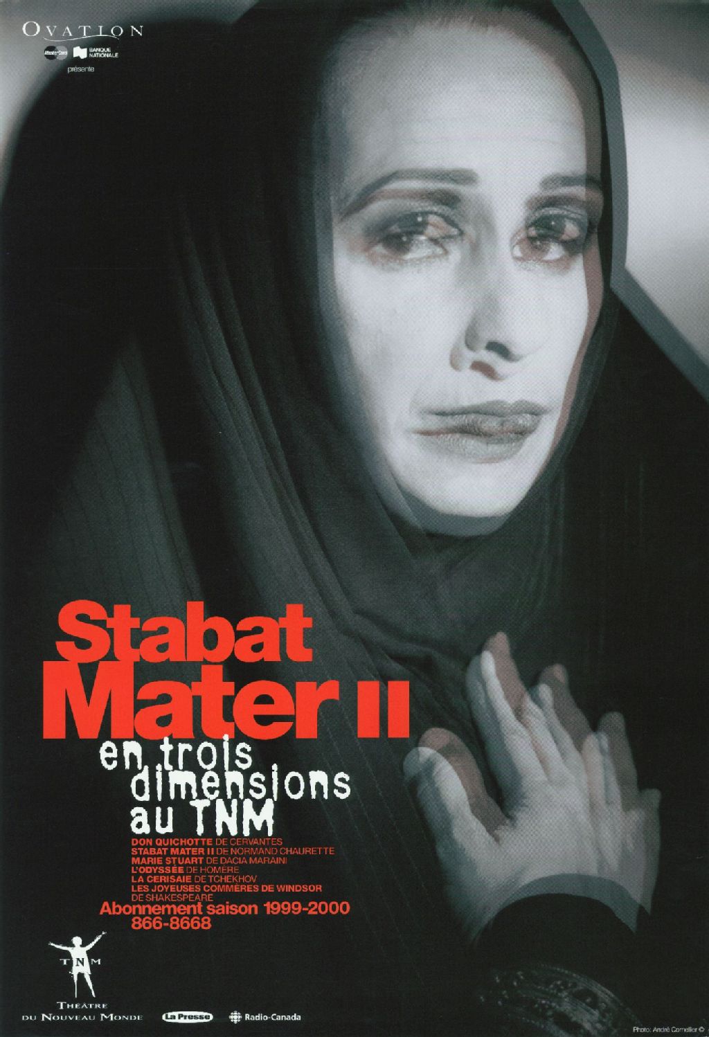Ovation, Master Card, Banque Nationale présente Stabat mater II en trois dimensions au TNM abonnement, saison 1999-2000 : Don Quichotte... Stabat Mater II... Marie Stuart... L'odyssée... La cerisaie... Les joyeuses commères de Windsor...