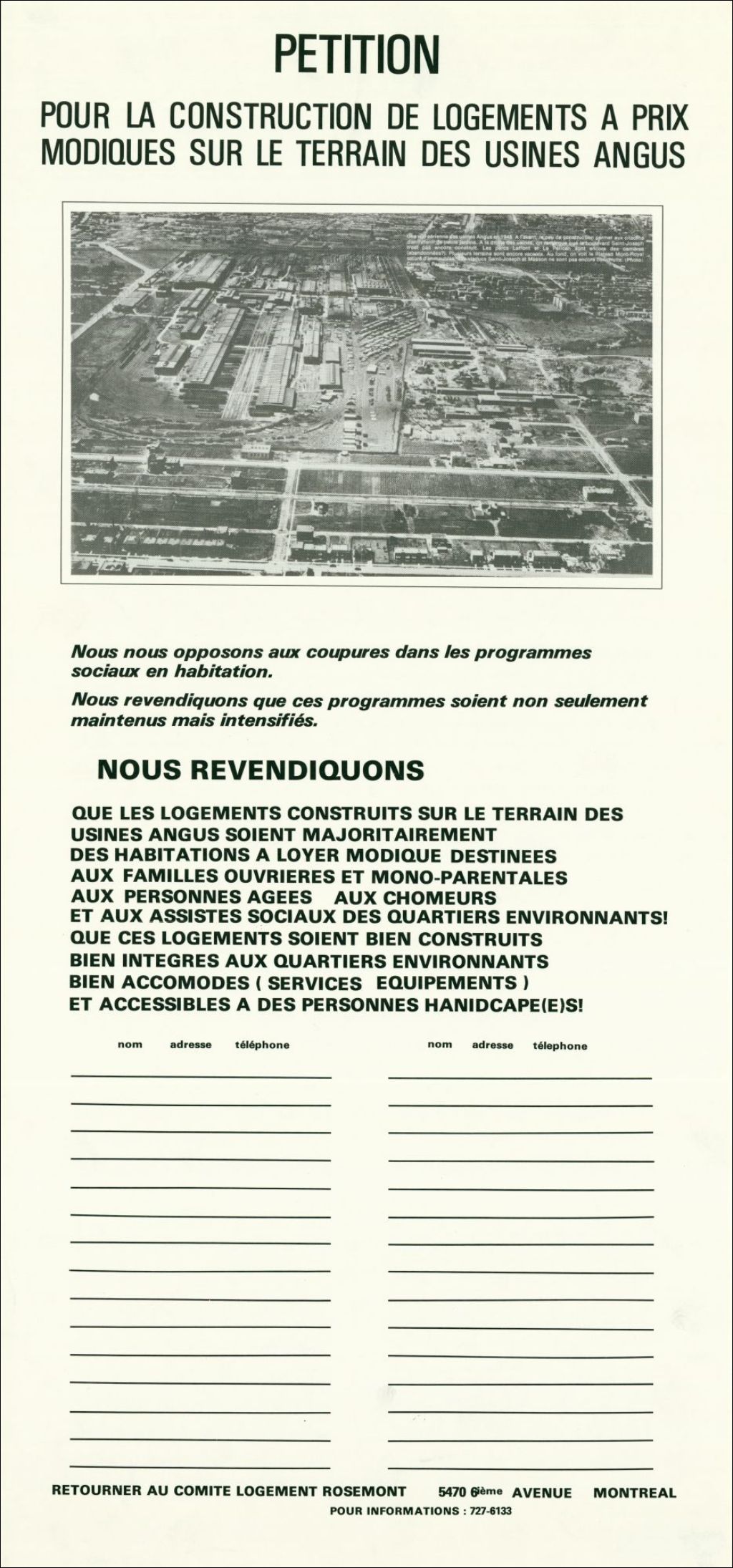 Pétition pour la construction de logements à prix modiques sur le terrain des usines Angus...