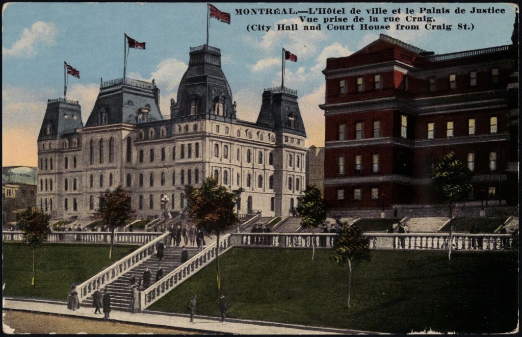 Montréal. - L'hôtel de ville et le palais de justice, vue prise de la rue Craig = Montréal. - City Hall and Court House from Craig St.