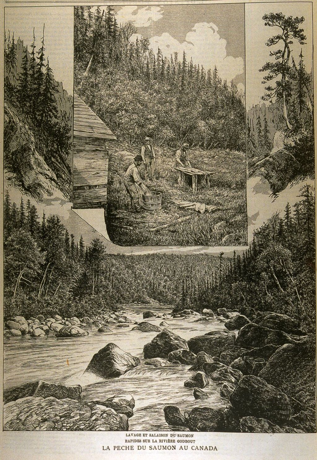 La pêche du saumon au Canada lavage et salaison du saumon et rapides de la rivière Godbout