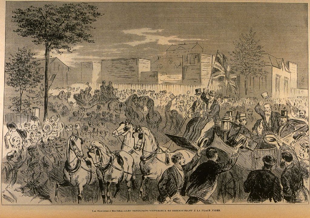 Les élections à Montréal les candidats victorieux se rencontrant à la place Viger