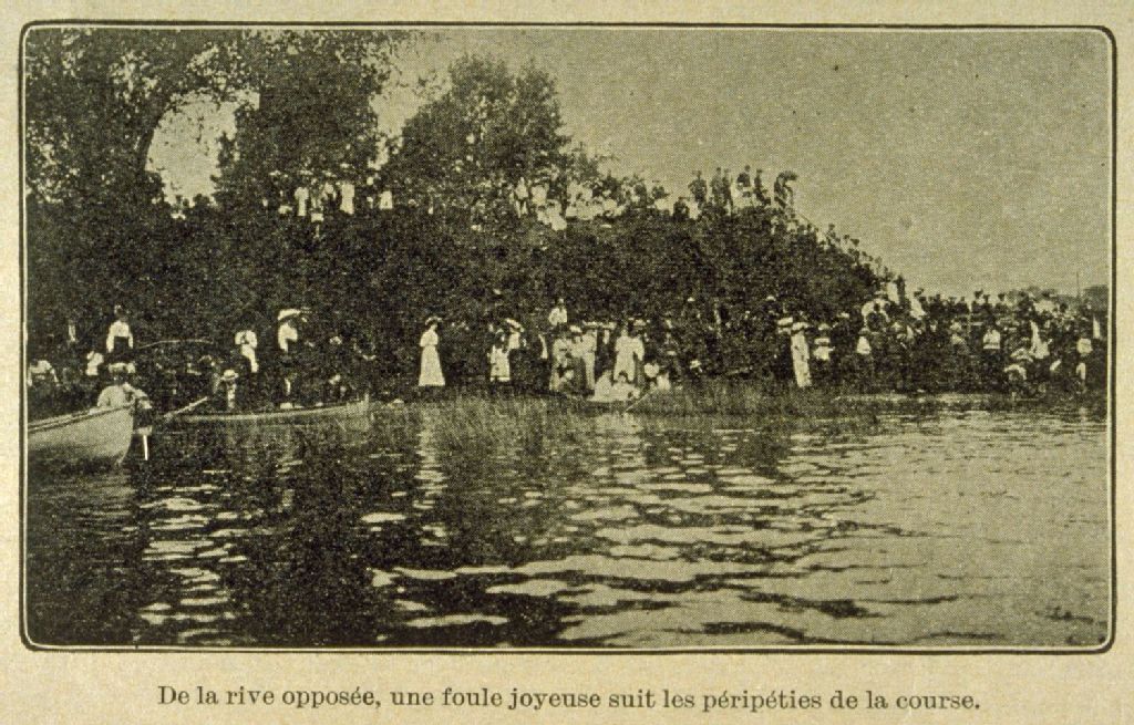 Un événement sportif [les régates de Saint-Jean] de la rive opposée une foule joyeuse suit les péripéties de la course