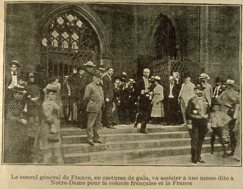 Comment les français célèbrent leur fête nationale [à Montréal] le consul général de France en costume de gala va assister à une messe dite à Notre-Dame pour la colonie française et la France