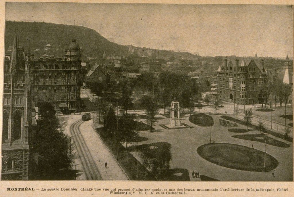Montréal Le square Dominion dégage une vue qui permet d'admirer quelques-uns des beaux monuments d'architecture de la métropole, l'hôtel Windsor, le Y.M.C.A., et la cathédrale