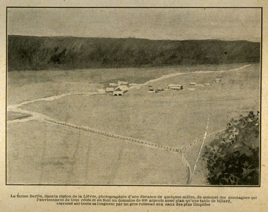La région de la Lièvre La ferme Bertin, dans la région de la Lièvre, photographié d'une distance de quelques milles, du sommet des montagnes qui l'environnent de tous côtés et en font un domaine de 600 arpents aussi plat qu'une table de billard, traversé sur toute sa longueur par un gros ruisseau aux eaux des plus limpides