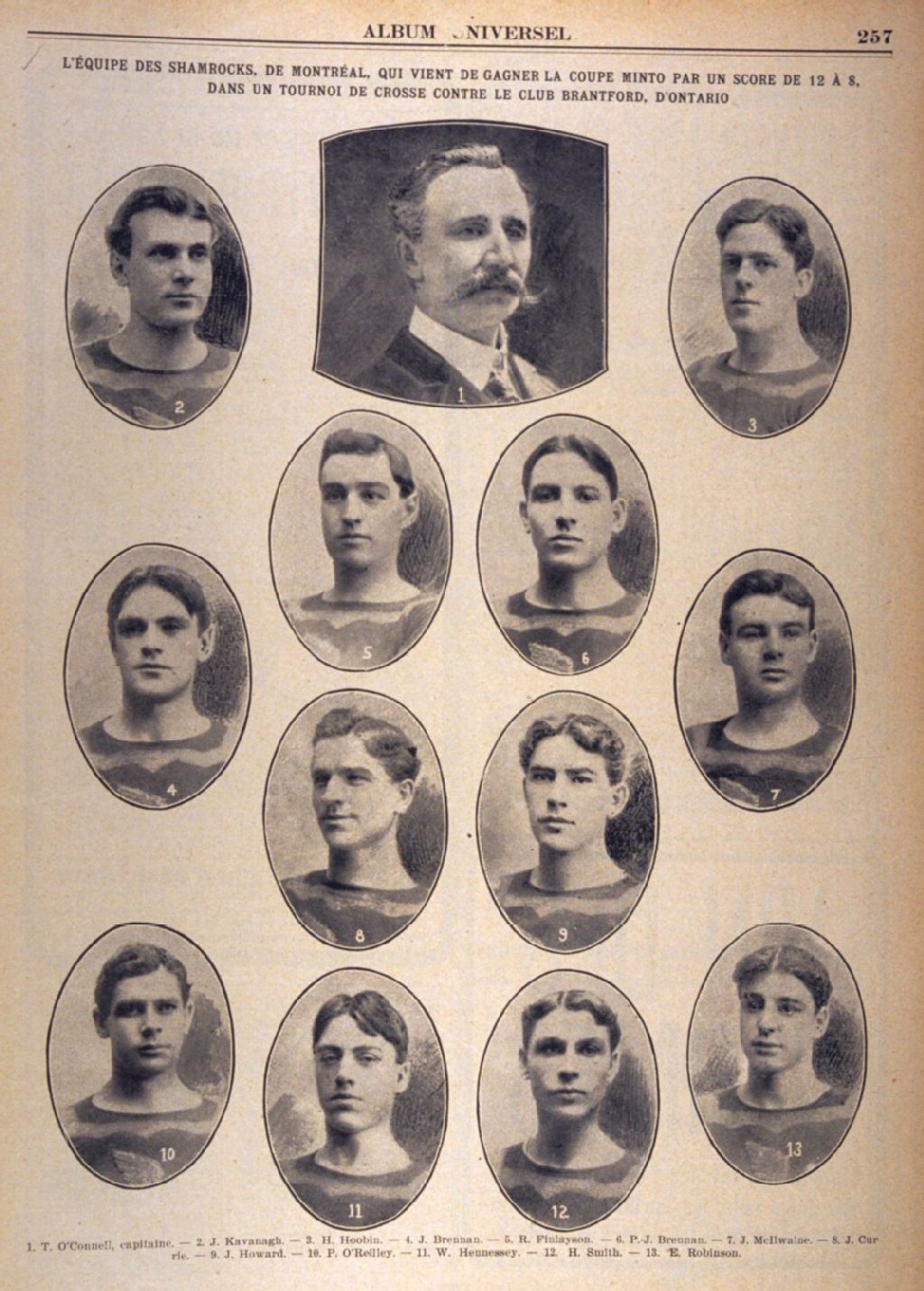 L'équipe des Shamrocks, de Montréal, qui vient de gagner la coupe Minto par un score de 12 à 8, dans un tournoi de crosse contre le club Brantford, d'Ontario