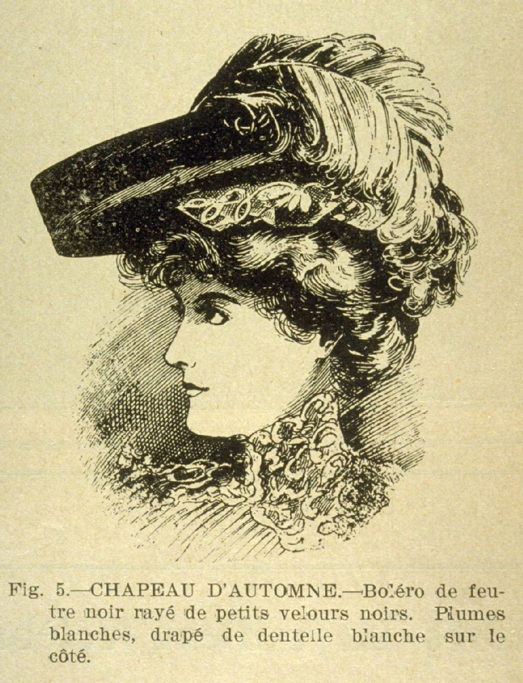 Chapeau d'automne Boléro de feutre noir rayé de petits velours noirs - Plumes blanches, drapé de dentelle blanche sur le côté