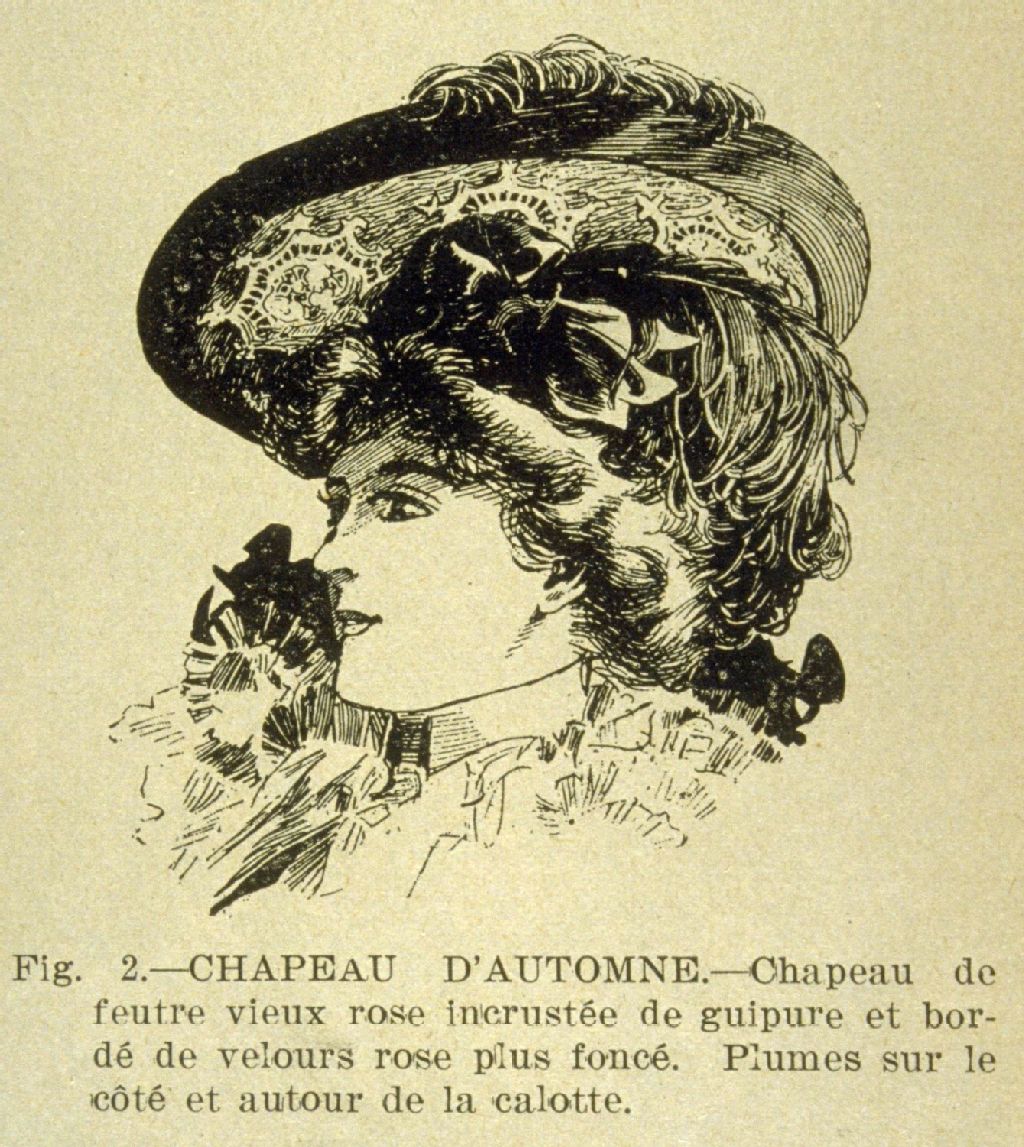Chapeau d'automne Chapeau de feutre vieux rose incrustée de guipure et bordée de velours rose plus foncée. Plumes sur le côté et autour de la calotte
