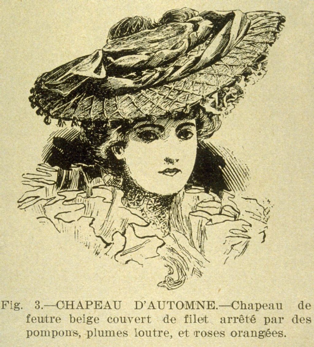 Chapeau d'automne Chapeau de feutre beige couvert de filet arrêté par des pompons, plumes loutre, et roses orangées