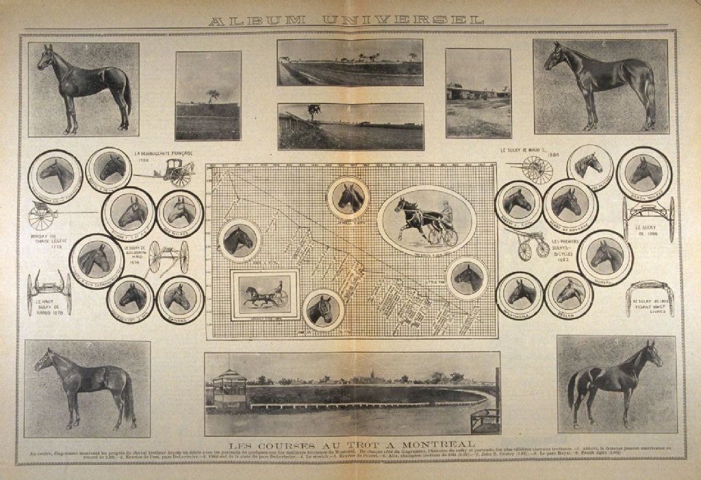 Les courses au trot à Montréal Au centre, diagramme montrant les progrès du cheval trotteur depuis un siècle avec les portraits de quelques-uns des meilleurs trotteurs de Montréal ; De chaque côté du diagramme, l'histoire du sulky et portraits des plus célèbres chevaux trotteurs