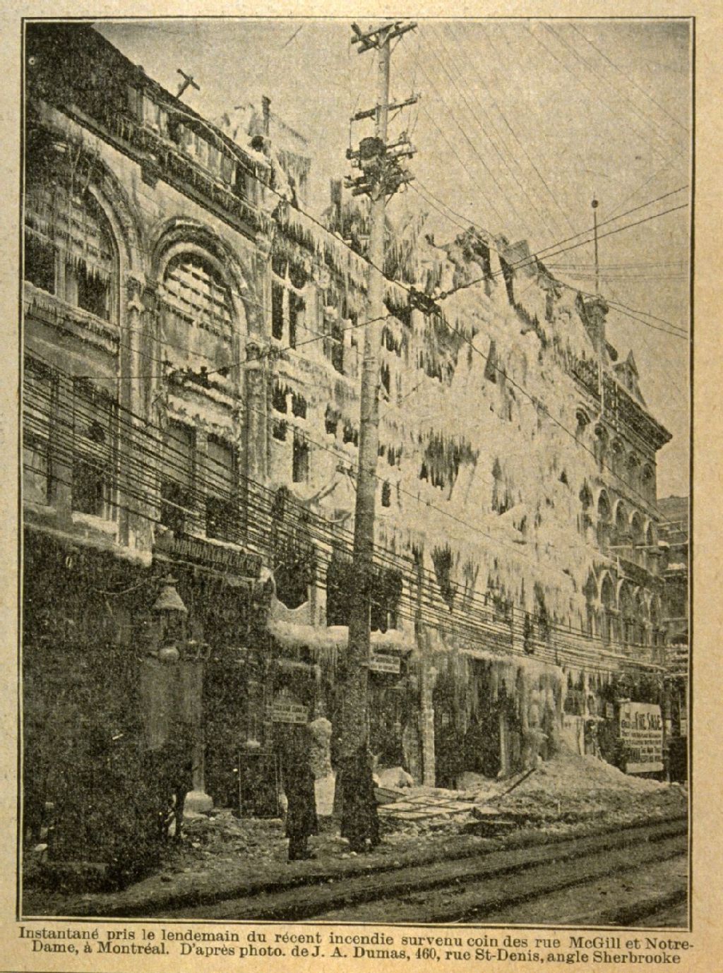Instantané pris le lendemain du récent incendie survenu coin des rues McGill et Notre-Dame, à Montréal