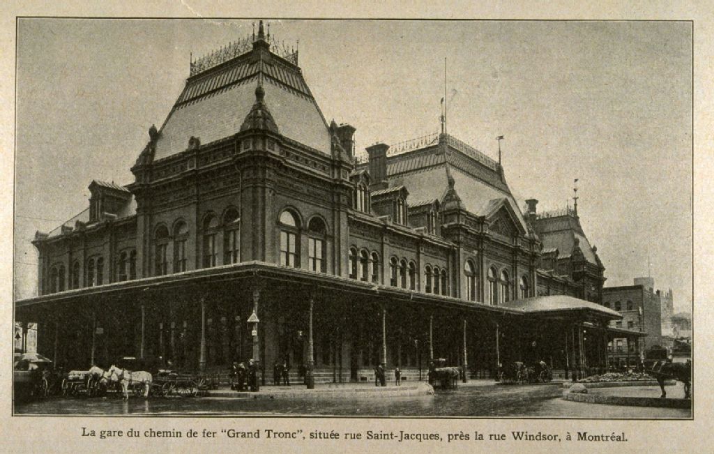 La gare du chemin de fer "Grand Tronc" située rue Saint-Jacques près de la rue Windsor à Montréal