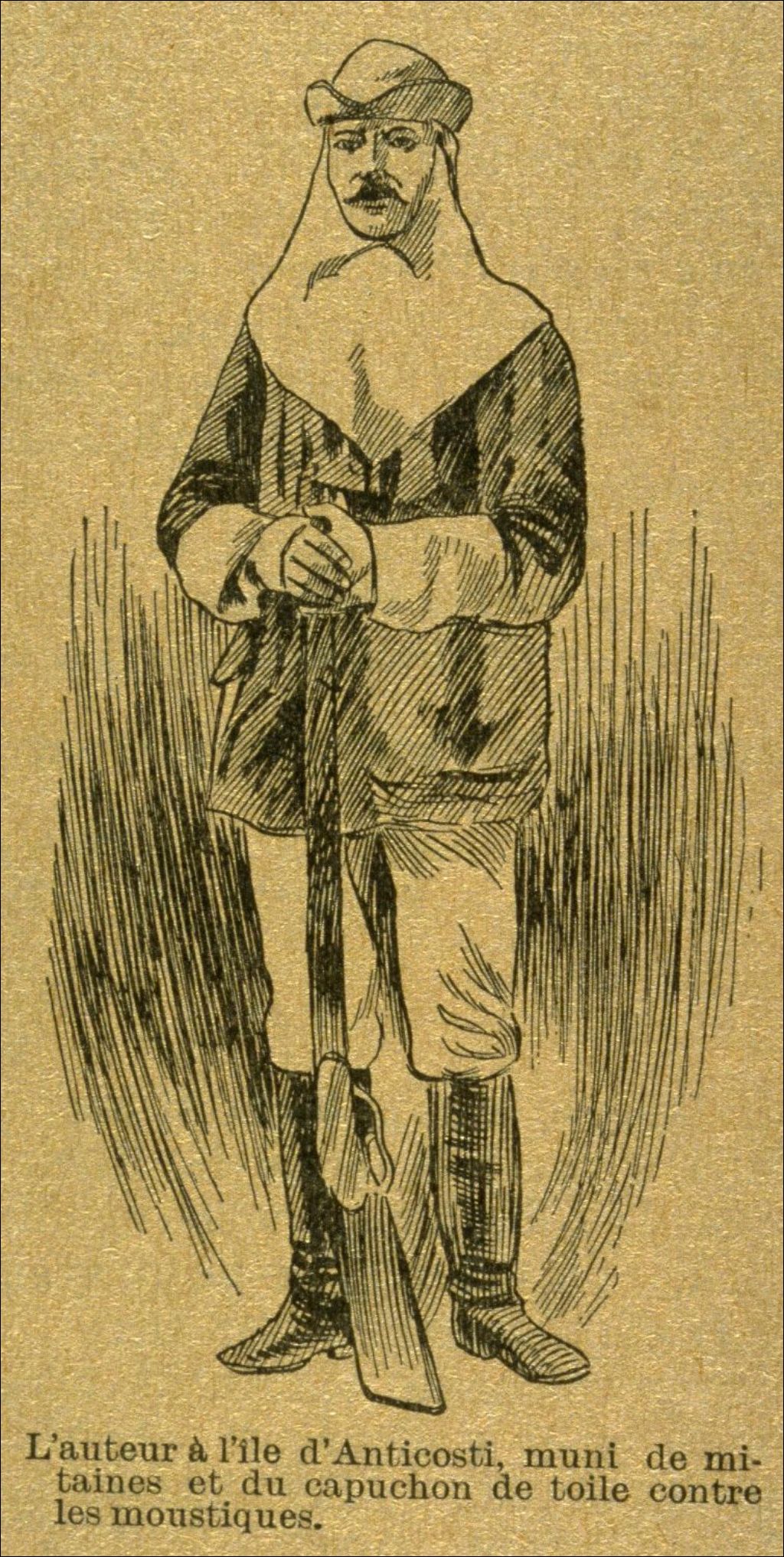 Les moustiques de l'île d'Anticosti l'auteur à l'île muni de mitaines et du capuchon de toile contre les moustiques