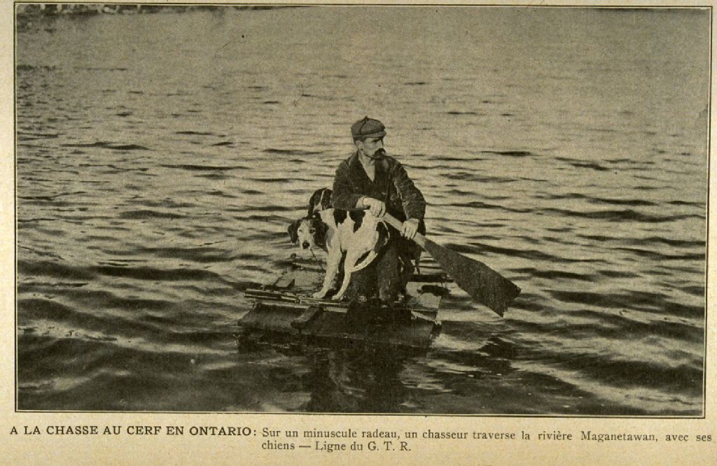 À la chasse au cerf au Ontario sur un minuscule radeau un chasseur traverse la rivière Maganetawan avec ses chiens