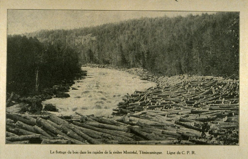 Le flottage du bois dans les rapides de la rivière Montréal, Témiscamingue, ligne du C.P.R.