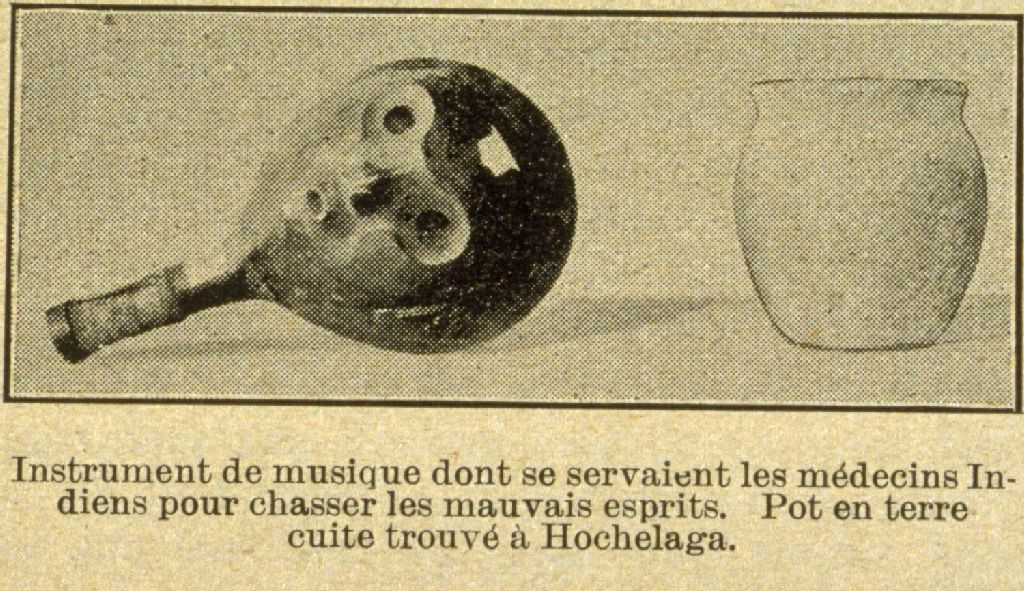 Le château de Ramezay instrument de musique dont se servaient les médecins Indiens pour chasser les mauvais esprits et pot en terre cuite trouvé à Hochelaga