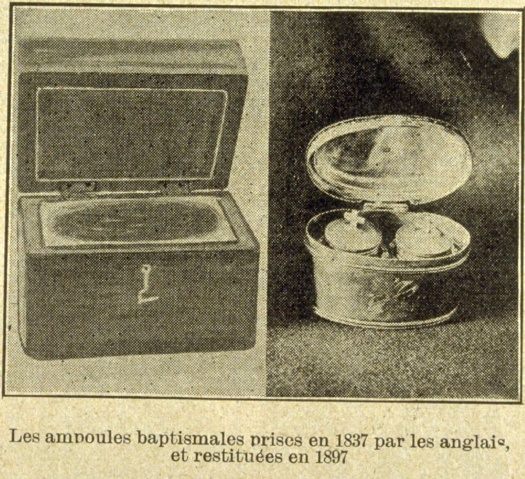 La paroisse de Saint-Eustache les ampoules baptismales prises en 1837 par les anglais et restituées en 1897