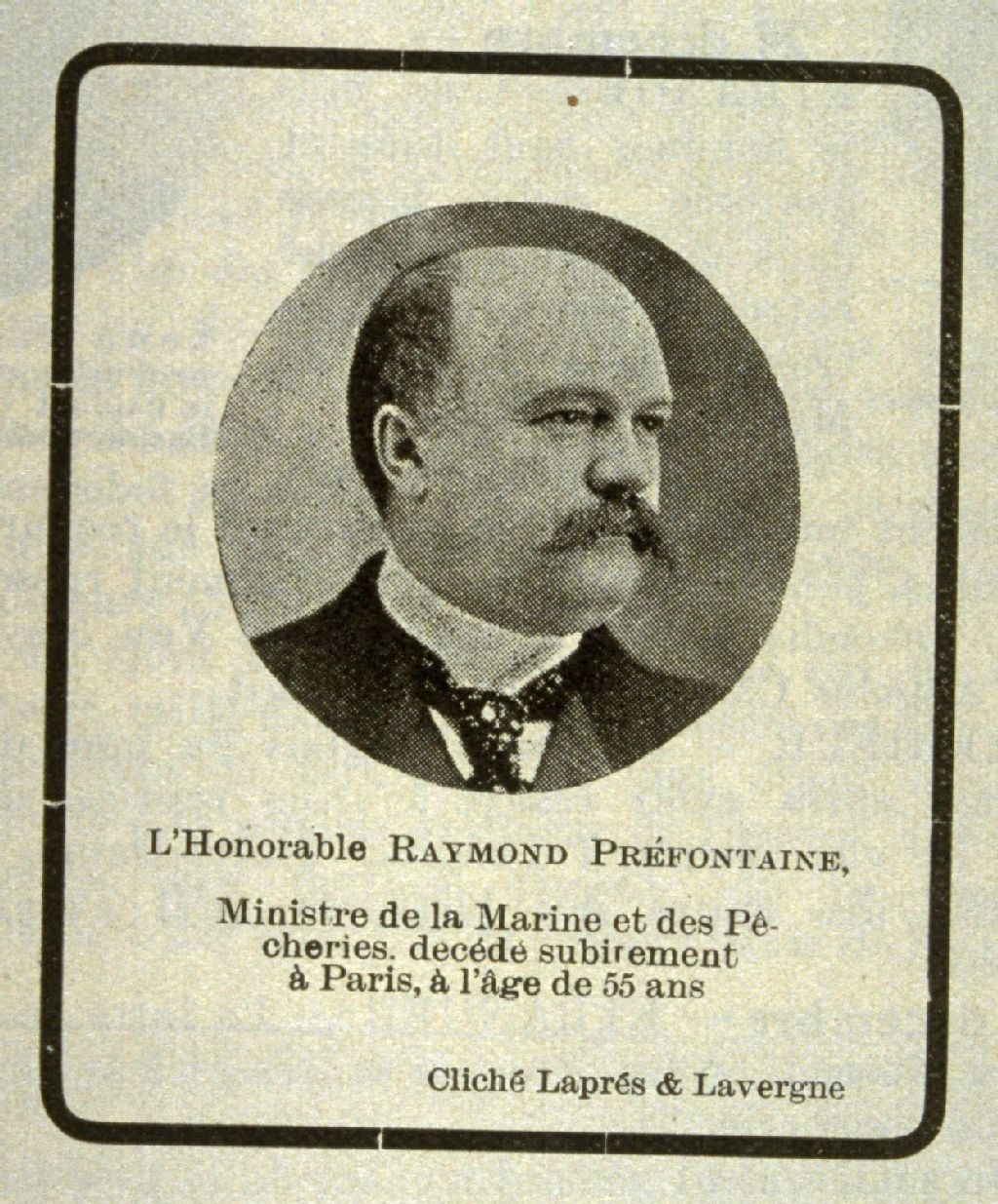 L'Honorable Raymond Préfontaine ministre de la marine et des pêcheries décédé subitement à Paris à l'âge de 55 ans /