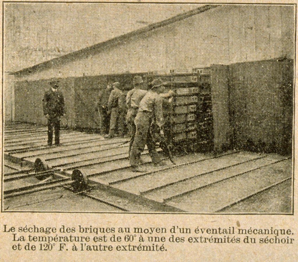 L'ouvrier briquetier à l'oeuvre le sèchage des briques au moyen d'un éventail mécanique