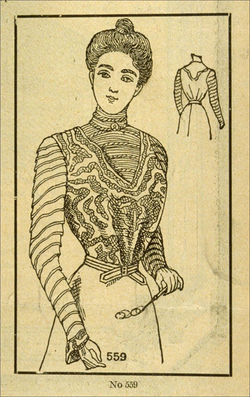 La mode No 550 : Corsage de brocart avec yoke à replis et manches en soie unie