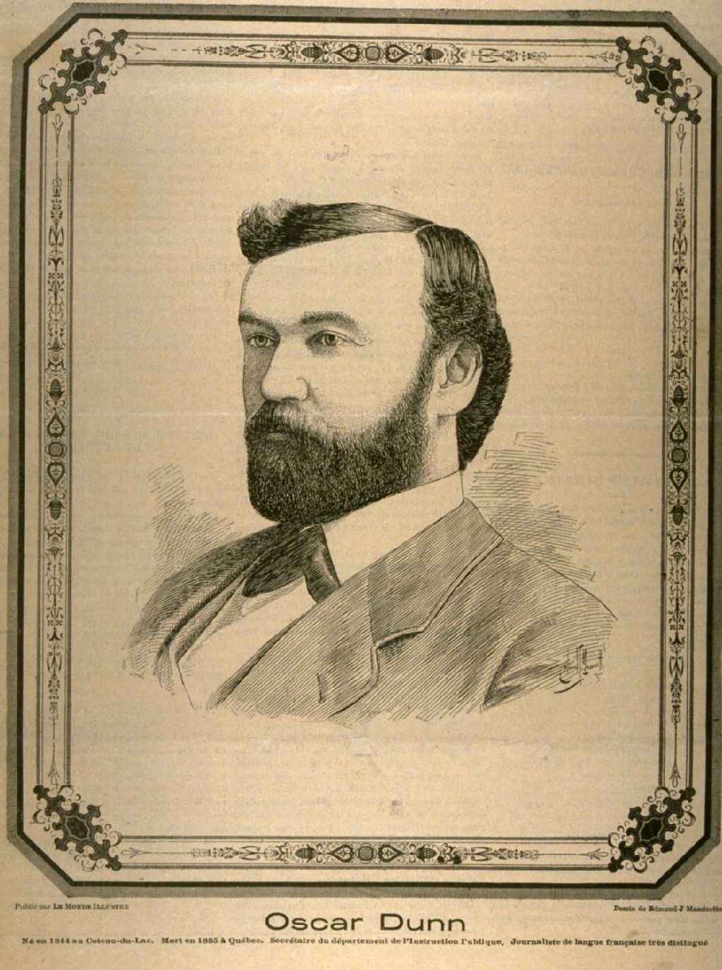 Oscar Dunn Né en 1844 au Coteau-du-Lac. Mort en 1885 à Québec. Secrétaire du département de l'Instruction publique. Journaliste de langue française très distingué /
