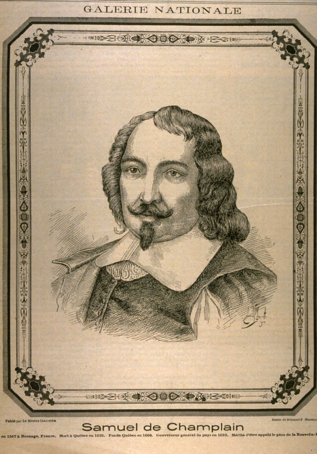 Samuel de Champlain Né en 1657 à Brouage, France. Mort à Québec en 1635. Fonda Québec en 1608. Gouverneur général du pays en 1633. Mérita d'être appelé le père de la Nouvelle-France /