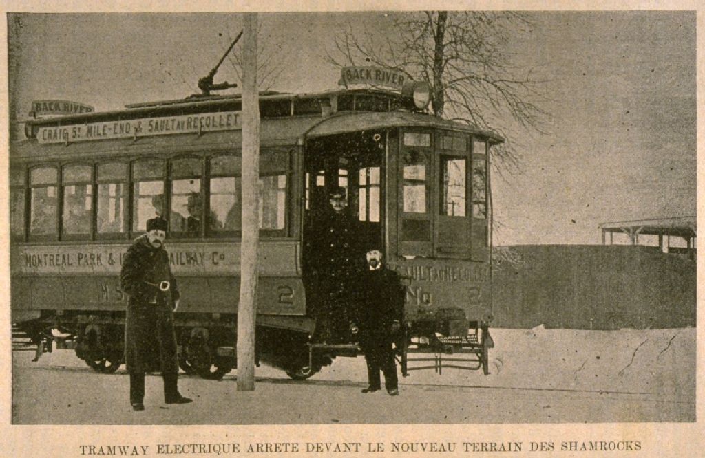 Tramway électrique arrêté devant le nouveau terrain des Shamrocks