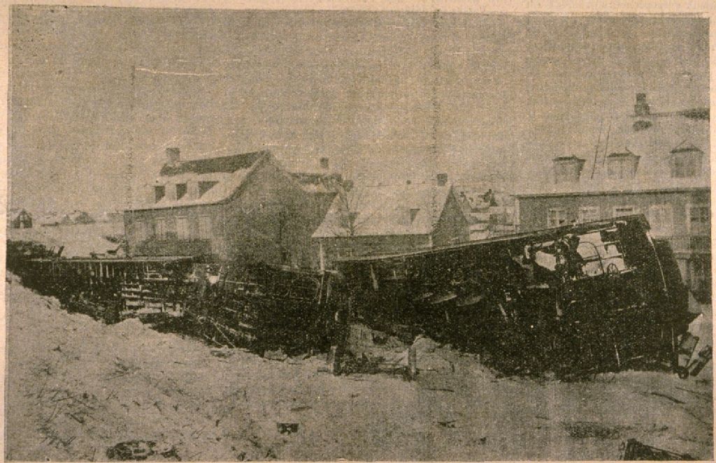 Terrible accident de chemin de fer, sur l'intercolonial, près de Lévis [Train effondré en face de plusieurs résidences] /