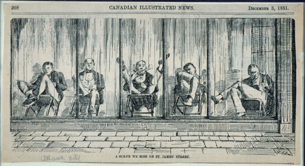 Caricature d'hommes assis dans le hall - rue St-Jacques