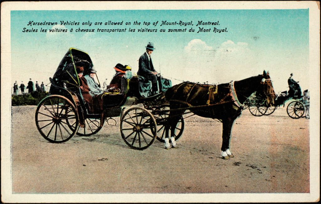 Horsedrawn vehicles only are allowed on the top of Mount-Royal, Montreal Montréal, seules les voitures à chevaux transportant [i.e. transportent] les visiteurs au sommet du Mont Royal