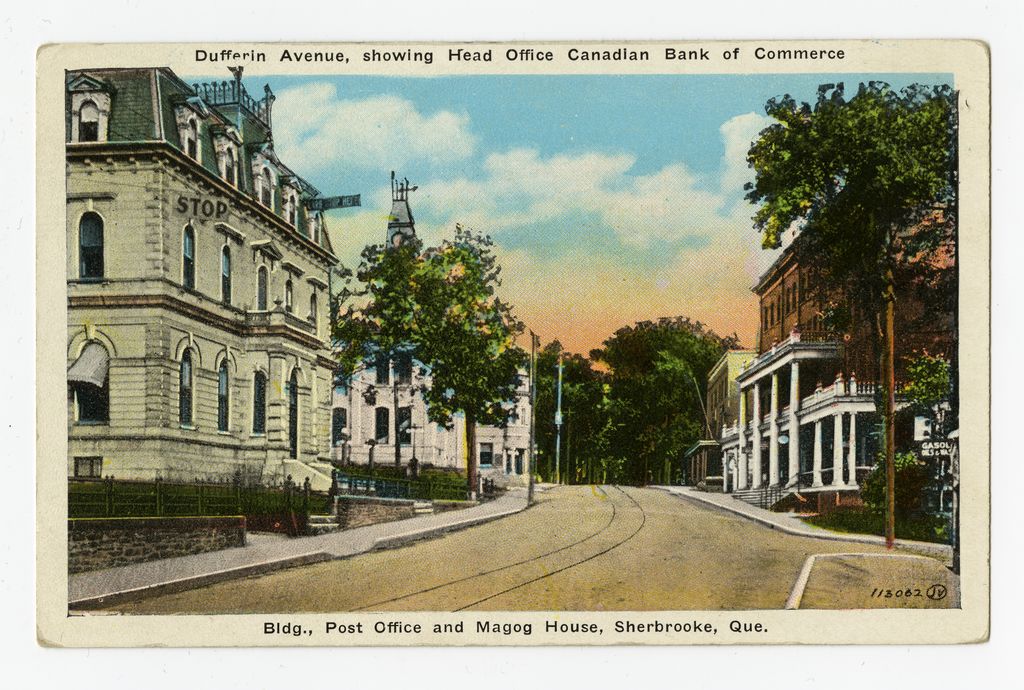 Dufferin Avenue, showing Head Office Canadian Bank of Commerce Bldg., Post Office and Magog House, Sherbrooke, Que.