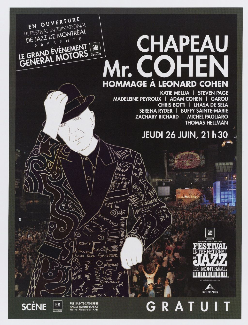 Chapeau Mr. Cohen, hommage à Leonard Cohen Katie Melua, Steven Page, Madeleine Peyroux ... : en ouverture le Festival international de jazz de Montréal présente le Grand événement General Motors ...