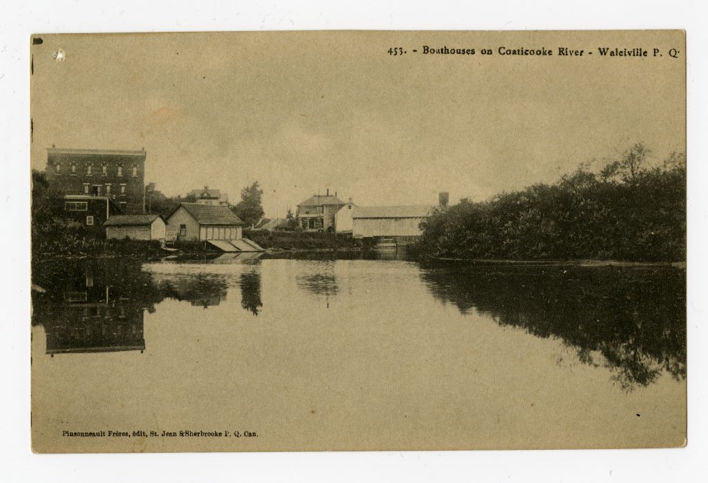 Boathouses on Coaticooke [i.e. Coaticook] River near Waleiville [i.e. Waterville], P.Q.