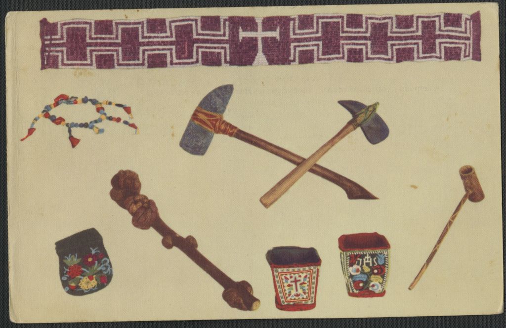 Mission Saint-François-Xavier, Caughnawaga, Qué. souvenirs indiens : wampum, tomahawks, calumet